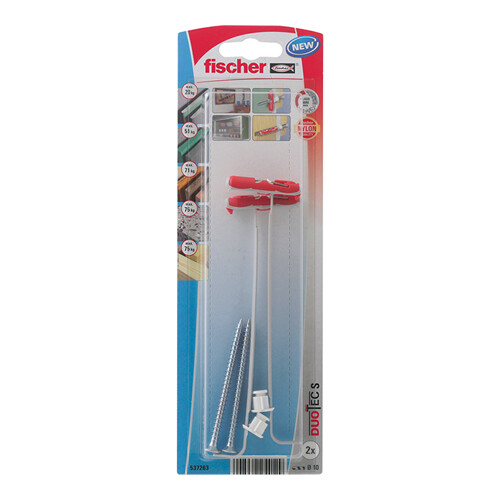 Το βύσμα fischer DUOTEC αποτελείται από υαλονισχυμένο πλαστικό (νάιλον) 2 συστατικών (σκληρό και μαλακό) και ειδικό μεταλλικό έλασμα (DUOTEC 12) για αντοχή σε μεγάλα φορτία εφελκυσμού και διάτμησης. Λόγω του ευέλικτου ελάσματος βίδας, συνεργάζεται τόσο με νοβοπανόβιδες, όσο και με βίδες ή ντιζάκια μετρικού σπειρώματος. Το πιο μαλακό γκρι νάιλον συστατικό μεταφέρει ομοιόμορφα το φορτίο στο λεπτότοιχο υλικό (γυψοσανίδα), ελαχιστοποιώντας την αποδυνάμωση του φέροντος υλικού. Το κοντό σώμα του διευκολύνει την τοποθέτηση σε στενές ή μονωμένες κοιλότητες μέσα από οπές διάτρησης 10mm και 12 mm. Το λευκό χιτώνιο και τα πτερύγια σταθεροποιούν την τοποθέτηση του βύσματος στην τρύπα. Στην ειδική προέκταση υπάρχει κλίμακα τοποθέτησης (fischer DUOTEC 12) για τον προσδιορισμό του απαιτούμενου μήκους βίδας.